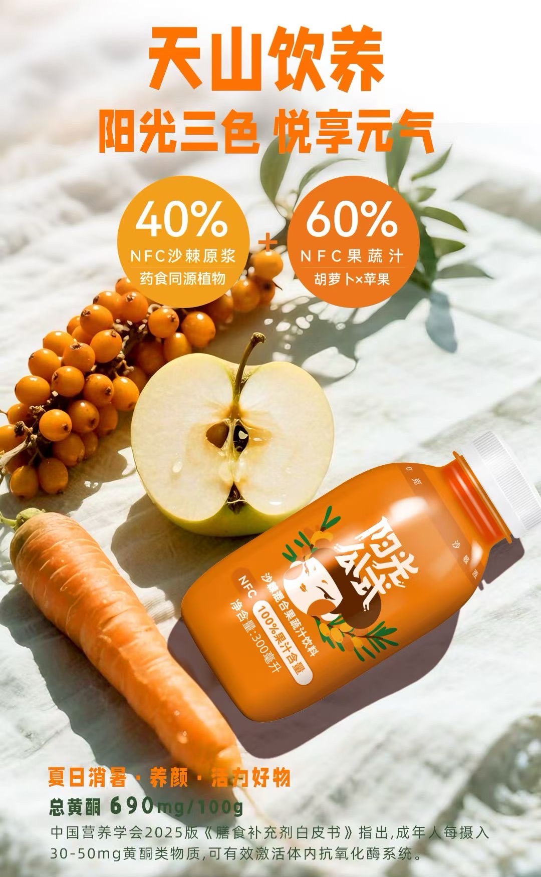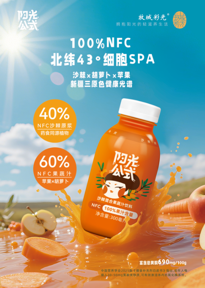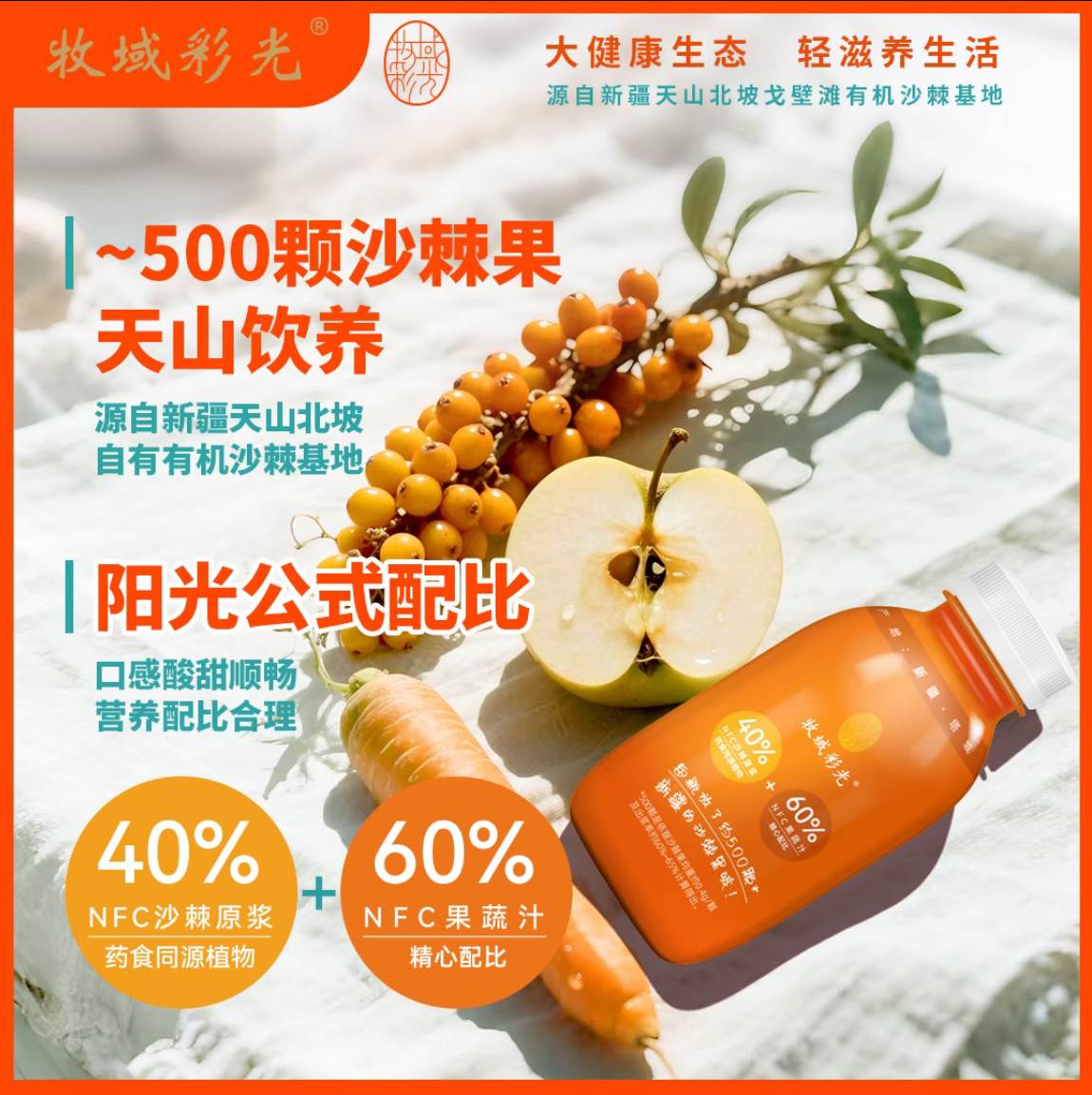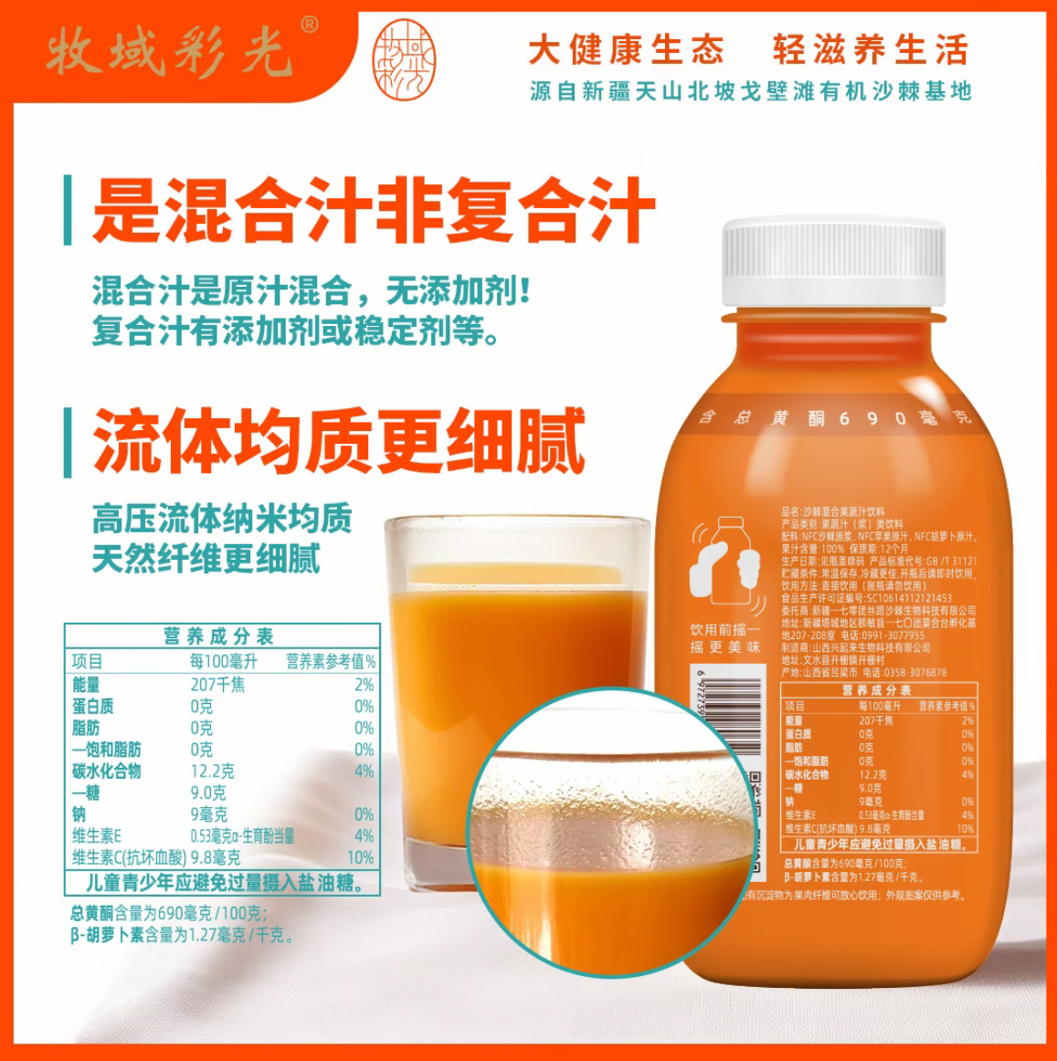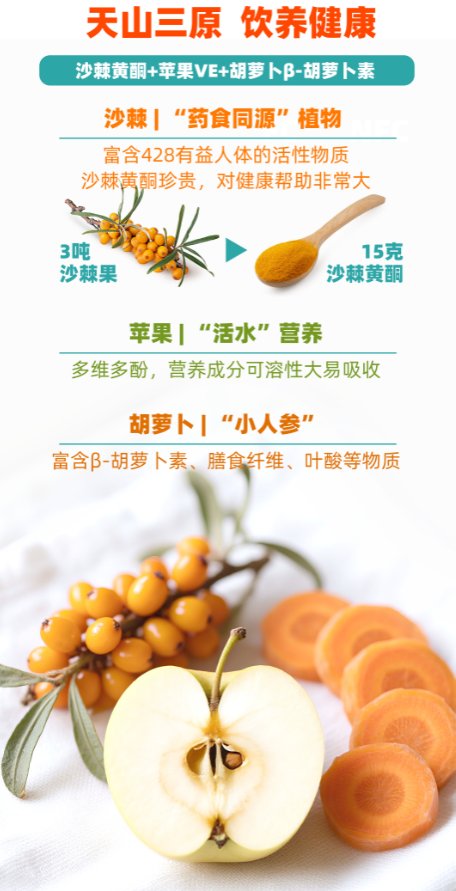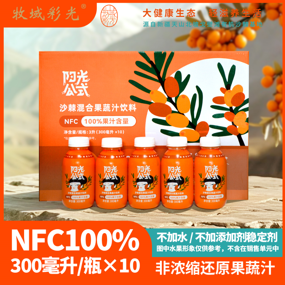 牧域彩光双有机沙棘果蔬汁采用生长在新疆天山北坡、古尔班通古特沙漠边缘戈壁荒原上的原生态有机沙棘果为原料,适合各类人群饮用。